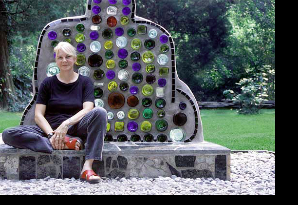 Another inspirer was early California outsider artist and mason, Simon Rodia whose Watts Towers awakened in her the vast creative potential of discarded and recycled materials, but, it was when she walked the nearby streets of Philadelphia that she discovered an artist who became a true living inspiration for her. She had encountered the public wall art and vibrant spirit of the prolific mosaic master, Isaiah Zagar, who then became a friend and mentor.